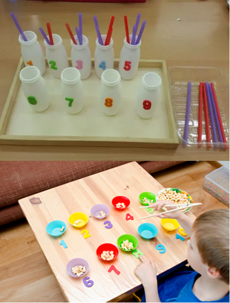 Desarrollo En esta actividad le mencionamos al niño que vamos a colocar la cantidad de objetos de acuerdo al numeral, por ejemplo, en el numeral 3 va a colocar la cantidad que lo representa. También se puede utilizar cuentas de varios colores, semillas, piedras fideos etc.